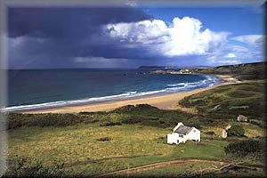 contains Ireland's smallest church, a thatched building about 10ft by 6ft dedicated to St Gobhan, the patron saint of builders. LocationWest on the B15 coast road from Ballycastle you will pass through the village of Ballintoy and Whitepark Bay is about another 2 miles. |