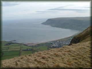 Walk 5 - Lurigethan MountainDate: Sunday 22th January 2006 Another fresh January morning about 10:00 and we didn't really know where to start, apart from Cushendall, so we asked the local garage attendants who were more than happy to direct us up the B14 for Ballymena and take the first left were we parked along the road. We set off from the foot of Lurigethan on the North-East side on the mountain with the usual gear, waterproofs as you never know with the weather despite the BBC's optimistic forecast. Just like Knocklayde, although not as high, Lurigethan is a quite steep climb. Helped along the way the many tracks created mainly by our woolly friends who climb it day after day, we climbed it about 40 minutes. Make sure you wear a pair of boots with good grip and a walking stick is also very helpful. The top is quite flat and no sign of the ancient flint axe factory that existed here thousands of years ago.